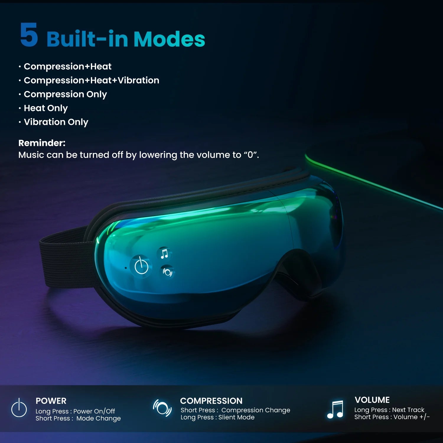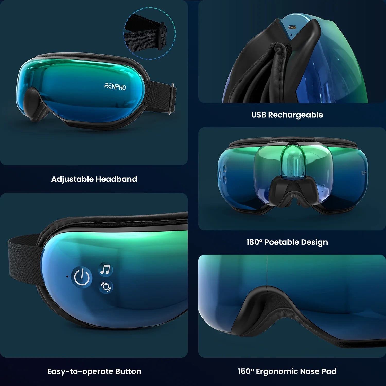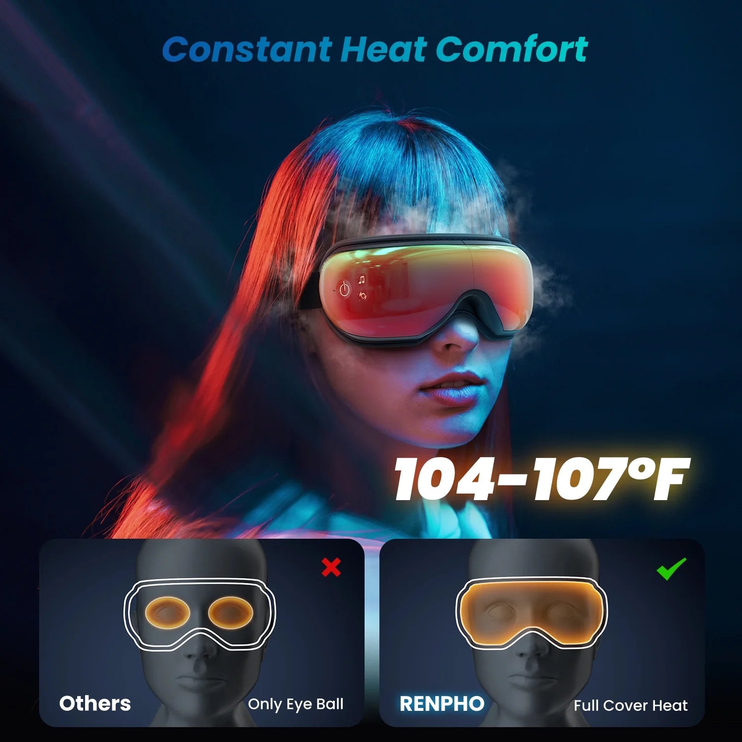 - Relaxation - Renpho’s eye massage adopts kneading, trigger point, oscillating pressure, and rhythmic percussion massaging. Built-in heating pads provide a comfortable temperature between 104 and 107 degrees Fahrenheit (40℃-42℃)